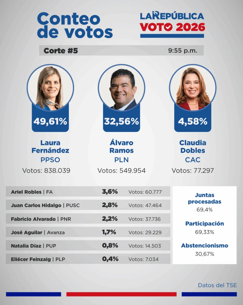 Al darse a conocer esta noche los primeros datos provisionales de la elección, el Tribunal Supremo de Elecciones (TSE) señala que la oficialista consiguió el 49,6% del respaldo electoral.